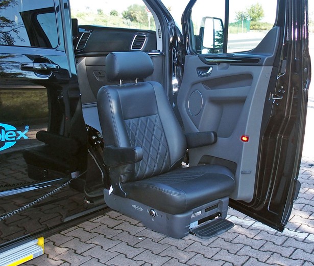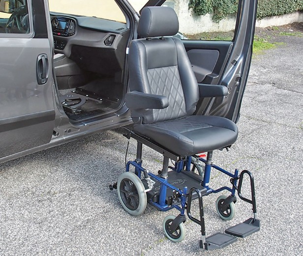 El seient, gràcies a la base giratòria, gira 90° cap a fora; a aquest punt l'estructura amb rodes s'enganxa al seient i aquest pot lliscar-se, fàcilment, juntament amb el passatger qui es troba, còmodament, assegut en una cadira de rodes ortopèdica fàcil de transportar.