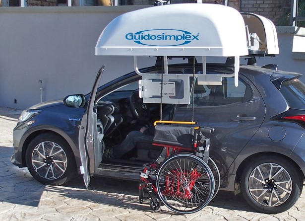 Este cargador de silla de ruedas se fija en el techo del automóvil a través de los soportes adecuados, y le permite colocar la misma en una estructura especial que la transportará sin daños y la protegerá del mal tiempo a través de una cubierta de ABS resistente. Dicho cargador, se puede pintar bajo pedido del color del automóvil.