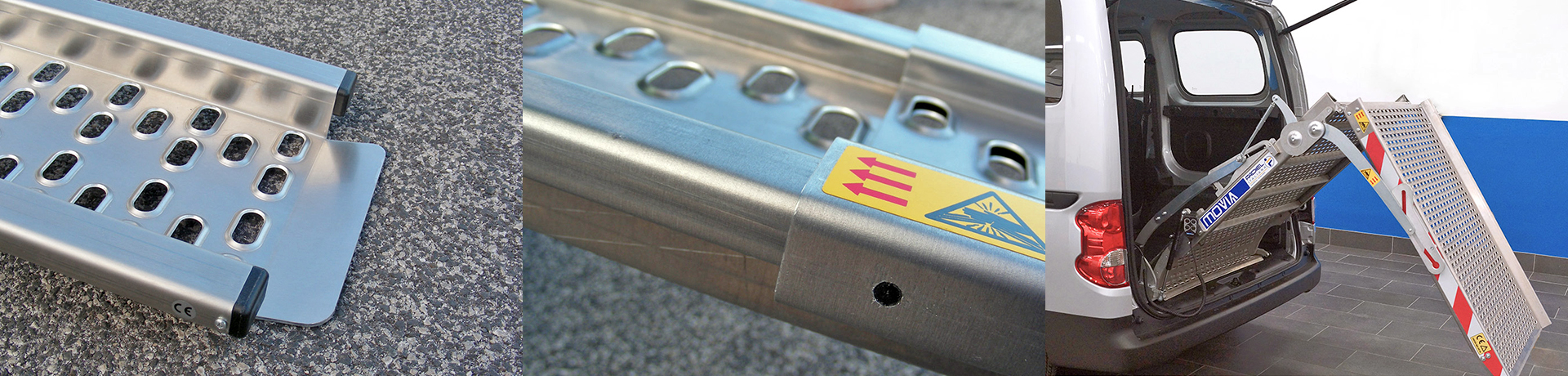 Las rampas Movia están construidas, íntegramente en aluminio, y sin soldaduras con longitudes entre 1,5 y 3,9 mts. Su rasgo distintivo es la superficie 'punzada', lo que las hace muy resistentes a pesar de su ligereza, y les proporciona una adherencia excepcional a prueba de agua, barro, etc.